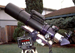 The telescope is balanced by moving it back and forth on the mount. For any given altitude there is one and only one spot for perfect balance. As you move away from that spot, balance become poorer. In practical terms, there are only about two balance points needed for viewing most of the sky. On good point is at about 45 degrees elevation and the other is at about 75 degrees. In order to be able to achieve balance at these points, the operator must be able move the telescope backwards and forwards on the mount. The TeleVue telescope mounting hardware provides for this needed movement. The mounting hardware supplied by Astro-Physics for the Traveler makes this movement on the Gibraltar impossible. This is why you hear of so many Traveler (and other telescope) owners complaining of the Gibraltar mounts. For this particular Traveler, the problem was solved by using Losmandy "C" plates and clamps and some wooden planks for mounting. You can click on the upper image to get a good look at this custom mounting.